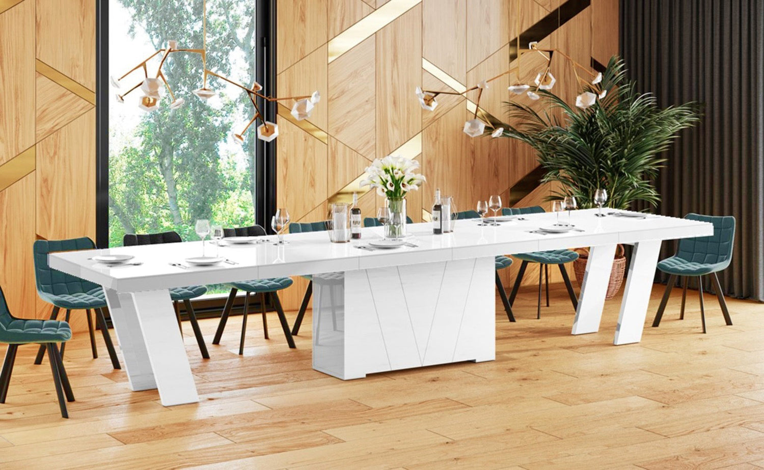 Maxima House Dining Set ALETA 11 pcs. modern white glossy Dining Table with 4 self-starting leaves plus 10 chairs